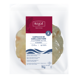 Prepare the carpaccio: Unmold the cod carpaccio onto the plate 10 minutes before serving to let it come to room temperature.