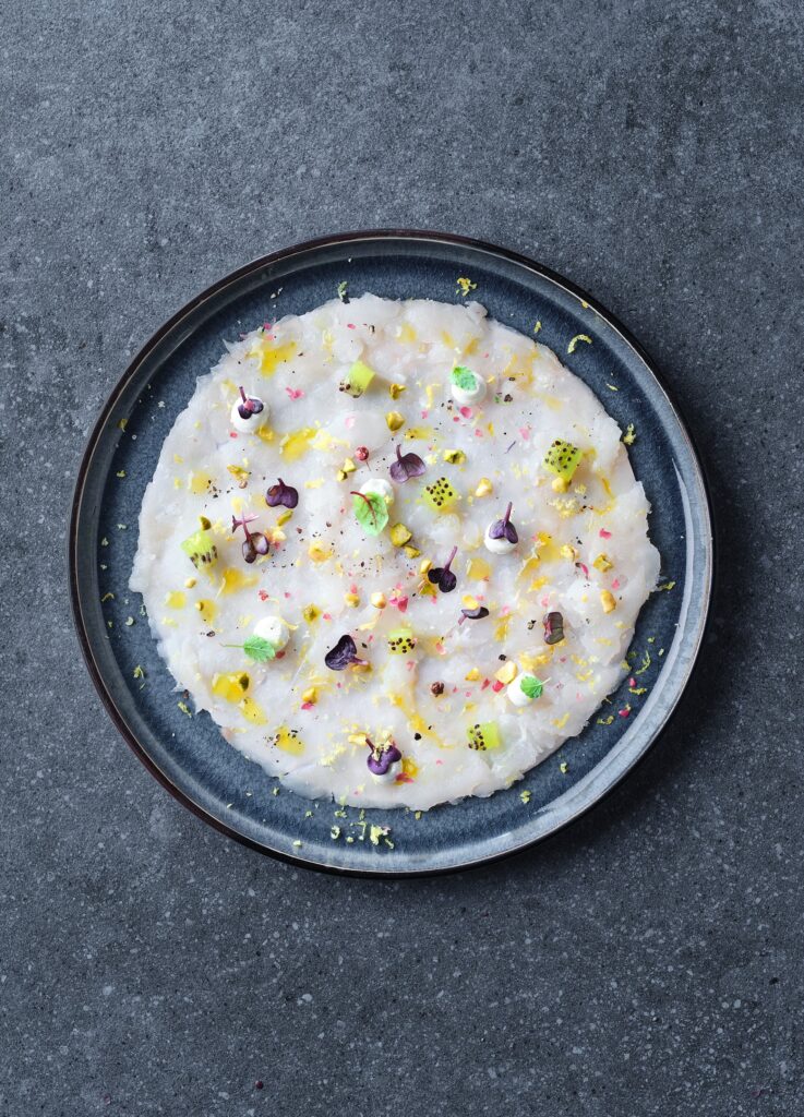 Plate the dish: Place a few dots of whipped cream on the carpaccio and grate some lemon over it.