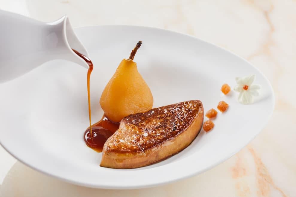 Home / Recipes / Chef's dishes / Escalope of goose foie gras from the South-West, tender pear with vanilla scents & duck jus.