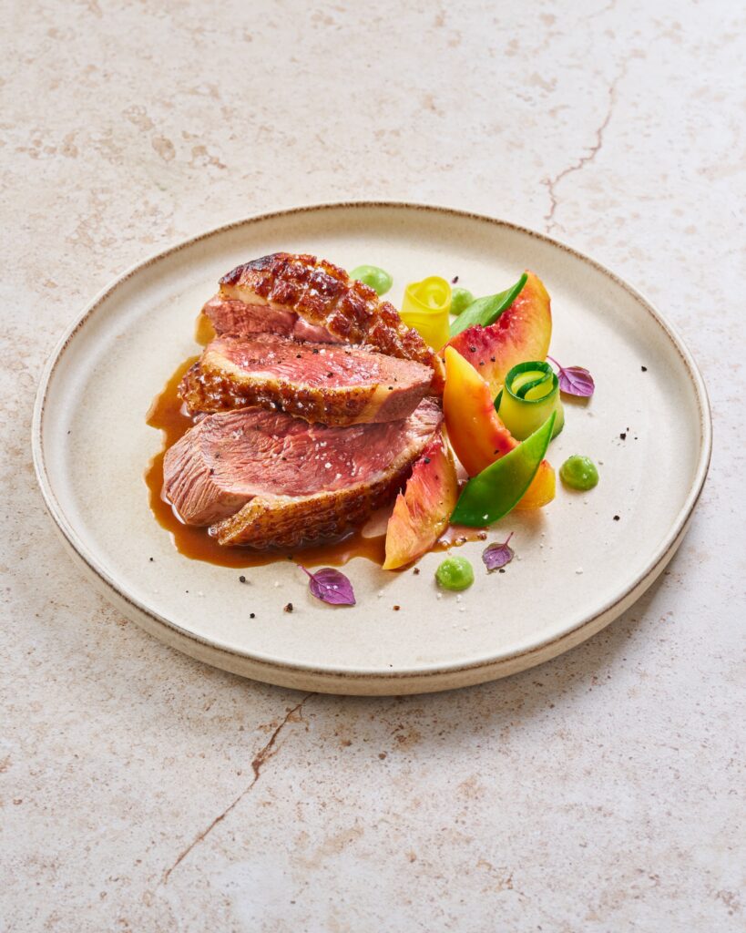 Home / Recipes / Chef's dishes / Roast duck breast with peach and summer vegetables