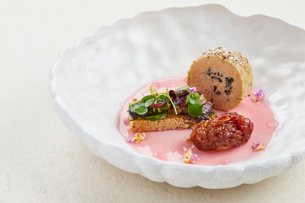Slice 70 grams of the truffled ballotin using a paring knife, hot blade. Gently place the foie gras on the plate, along with a few drops of rosé champagne gel. Form a quenelle of chutney and place the vegetable bread on the plate. Add some Alloti Blossom flowers.