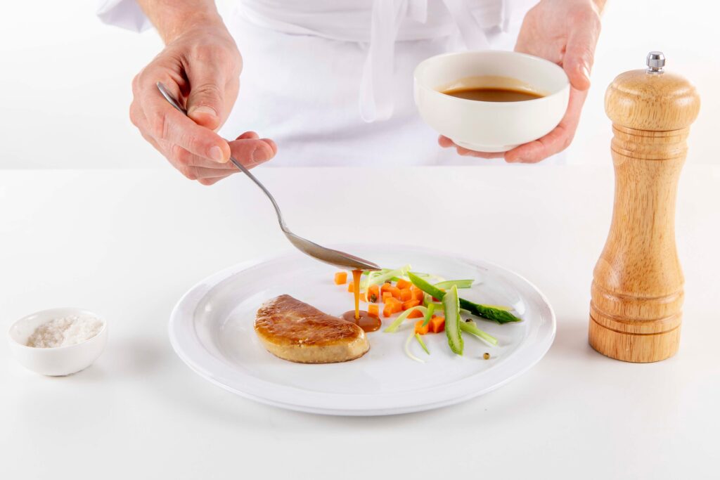 Montar el plato: Coloque las verduras en el plato, añada la escalopa de foie gras salteada y cubra con la salsa reducida con tomates.