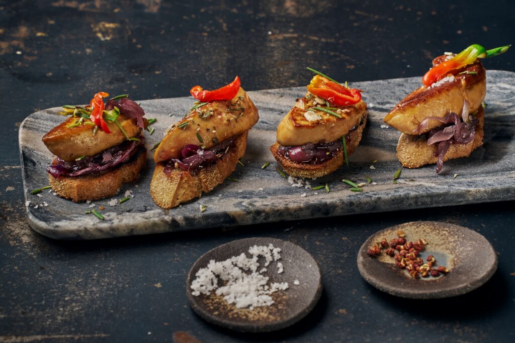 Ensamblar los pinchos: Coloque los crotones sobre una tabla, añada una cucharada de fondo de cebolla, luego coloque una mini escalope de foie gras encima.