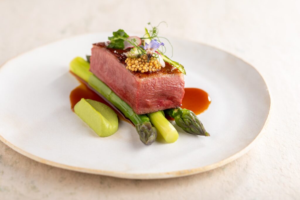 Inicio / Recetas / Platos de chefs / Magret de pato a la sartén, espárragos verdes y semillas de mostaza