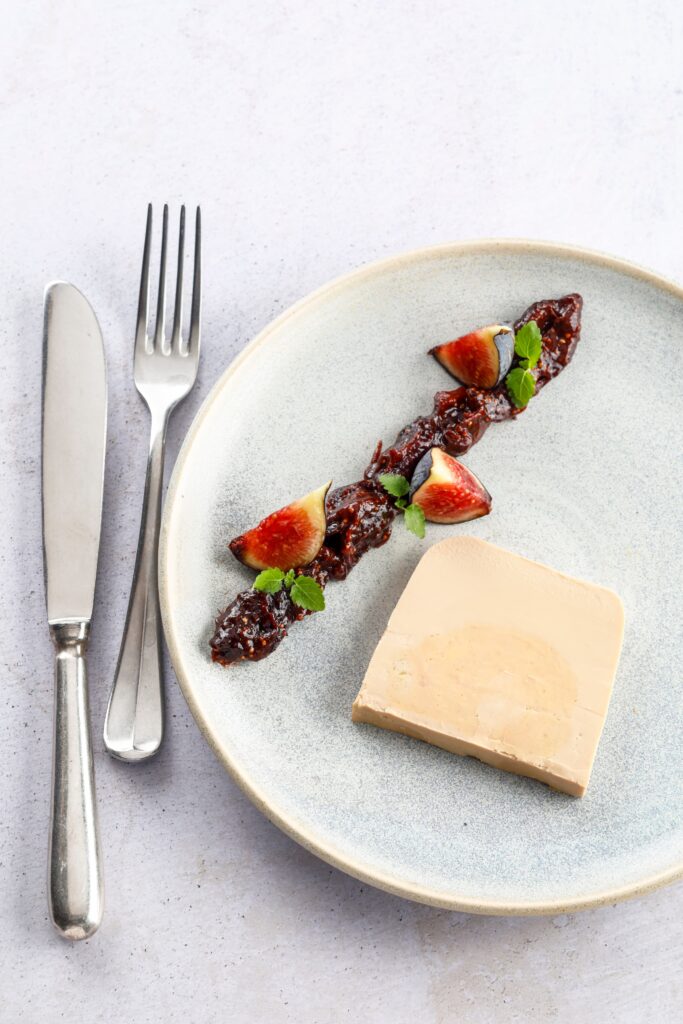 Trancher le foie gras: À l’aide d’une lyre ou d’un couteau à lame chaude, découpez une belle tranche de foie gras et déposez-la délicatement dans l’assiette.