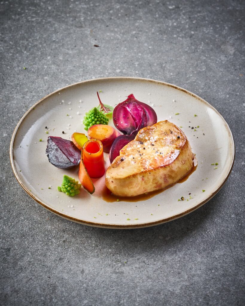 Montage de l’assiette: Dressez les légumes sur un côté de l’assiette et l’escalope de foie gras sur l’autre.