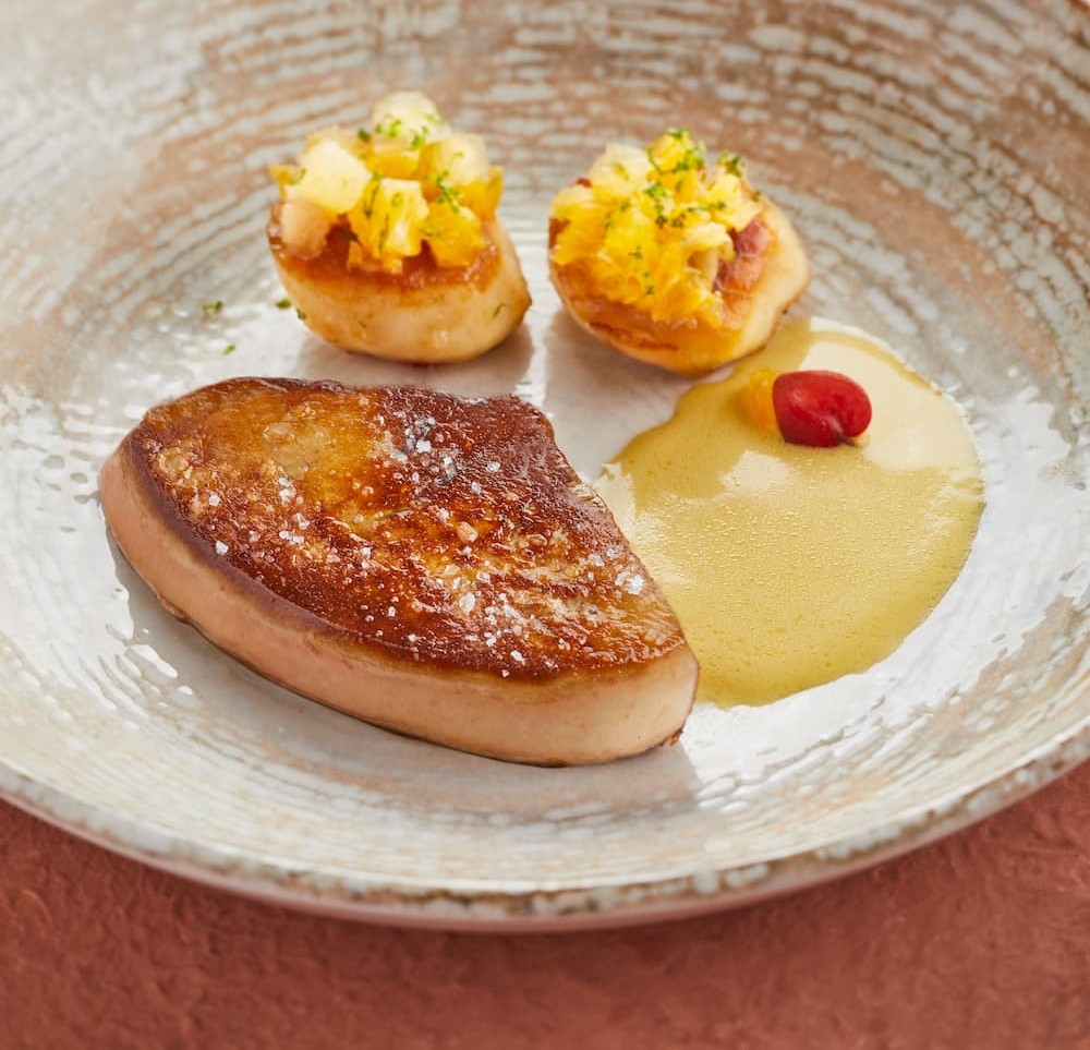 Accueil / Recettes / Plats de chefs / Noix de Saint Jacques, escalope d’oie du Sud-Ouest, condiments agrumes Jus d’orange & safran